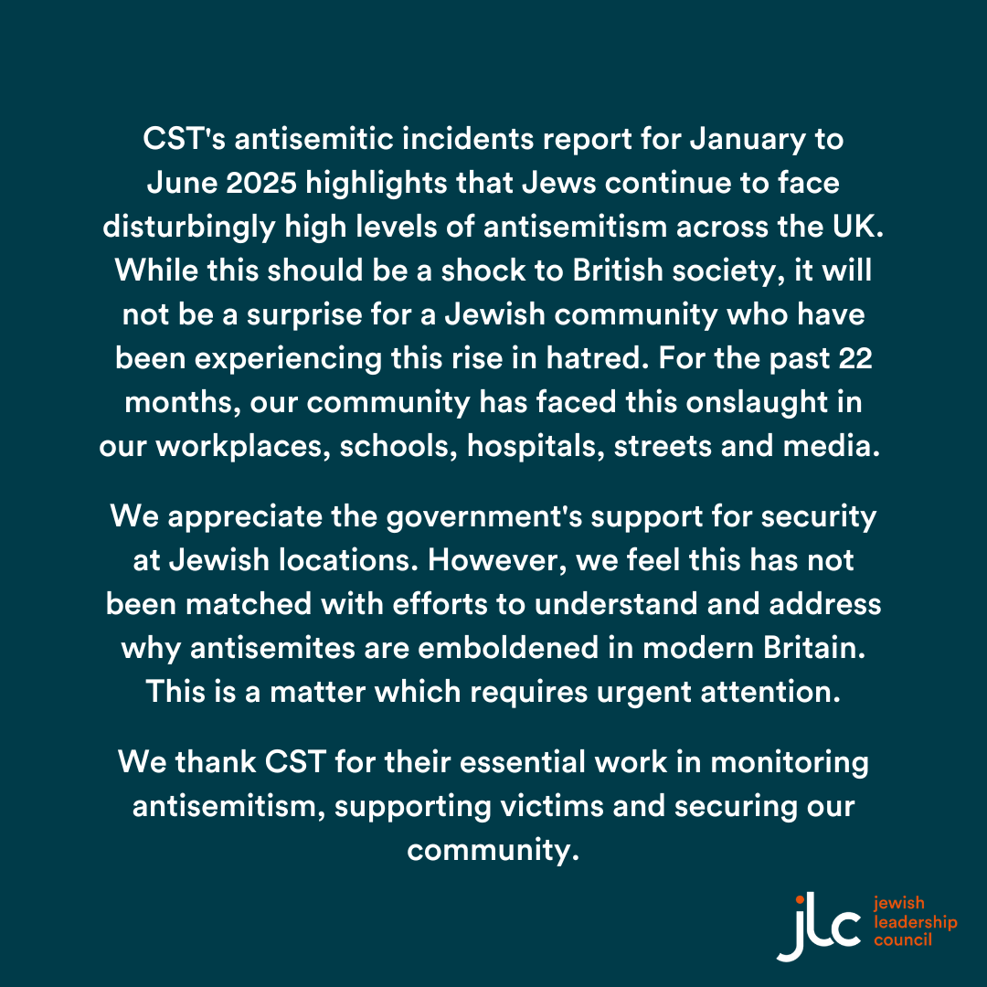 JLC Statement on CST’s Antisemitic Incidents Report January-June 2025 18 Aug Written By Tyla Dallas Tyla Dallas