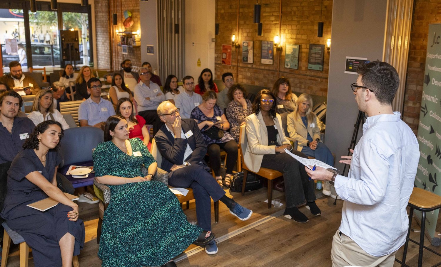 The second half of the evening featured breakout spaces. Eli Gaventa (JVN trustee) and Nina Freedman (JLC trustee) facilitated a Q&A/discussion for young trustees/potential trustees reflecting on what they’d heard, while Debbie Fox (Chair of Lead) and Osaro Otobo led a conversation space for senior communal lay leaders and professionals who shared their thoughts on the topic and possible ways forward.